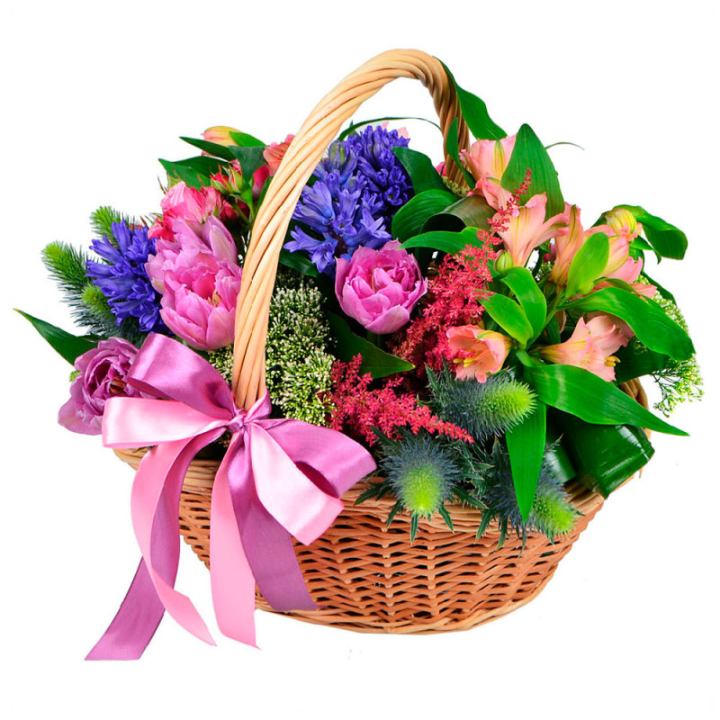 Яркая и жизнерадостная композиция из розовых тюльпанов, голубых гиацинтов, астильбы, эрингиума, персиковых альстромерий, трахелиума, брунии и зелени аспидистры. Все цветы гармонично размещены в плетёной корзине с изящной розовой лентой. Эта композиция создаёт атмосферу лёгкости и вдохновения. Идеальный подарок для любимой на День Святого Валентина.