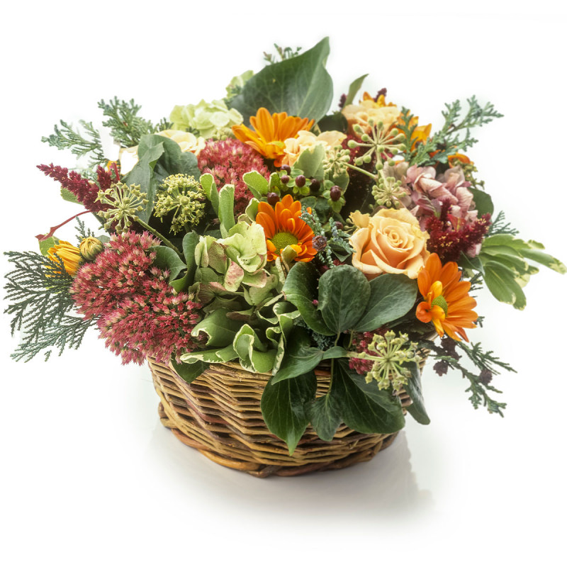 Эта композиция излучает теплую и радостную атмосферу благодаря ярким желтым розам и оранжевым хризантемам. В состав входят роза одноголовая желтая, хризантема кустовая оранжевая, очиток и туя, дополненные зеленью. Плетёная корзина с натуральным узором и оазисом обеспечивает надежное оформление и сохранность свежести. Идеально подойдет для встречи из поездки и порадует любимого мужчину.