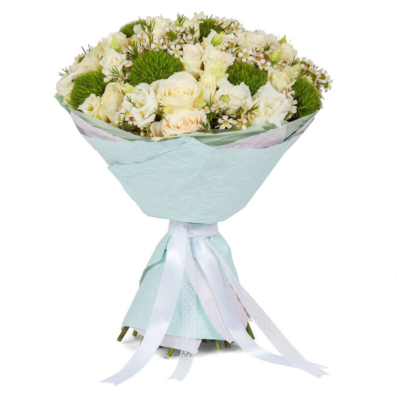 Этот нежный букет в белой цветовой гамме наполнен элегантностью. В его составе роскошные белые одноголовые и кустовые розы, белая эустома, зелёная гвоздика диантус и ваксфлауэр. Упакован в матовую плёнку светло-голубого оттенка и белую атласную ленту, что придаёт композиции изысканный вид. Букет создаёт атмосферу утончённости и гармонии. Подойдёт для поздравления мамы на День матери.