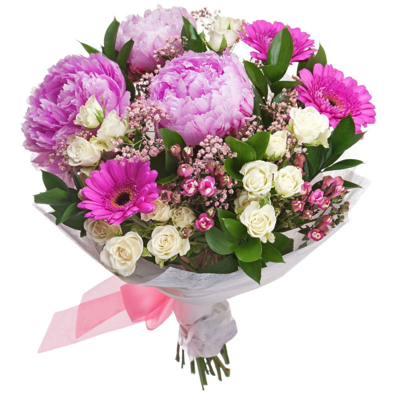 Яркий розовый оттенок вызывает эмоции нежности и романтики. В составе букета розовый пион, розовая гербера, белая кустовая роза, ваксфлауэр и гипсофила. Букет оформлен в белую матовую плёнку и перевязан розовой лентой. Эта композиция создаёт атмосферу лёгкости и весенней свежести. Идеально подходит для поздравления племянницы на годовщину.
