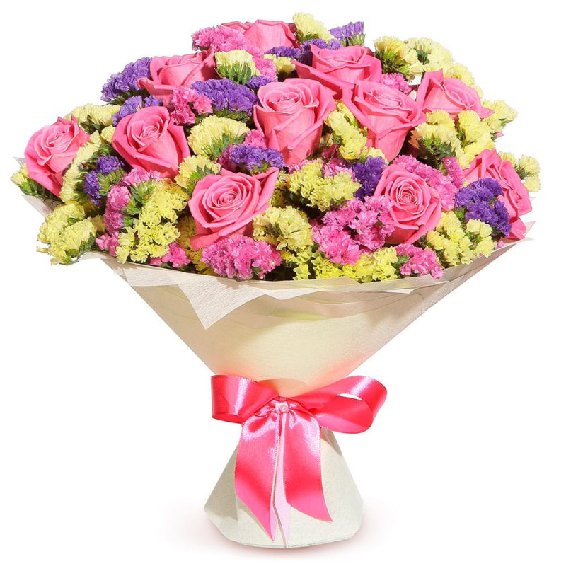 Яркие розовые розы и статица в миксе жёлтых и фиолетовых оттенков создают атмосферу радости и тепла. Букет состоит из роз одноголовых розовых и статицы микс (жёлтая, фиолетовая). Упакован в крафт с матовой плёнкой и украшен яркой розовой лентой. Эта композиция создаёт атмосферу праздника и идеально подойдёт для поздравления близкого человека с особым событием.