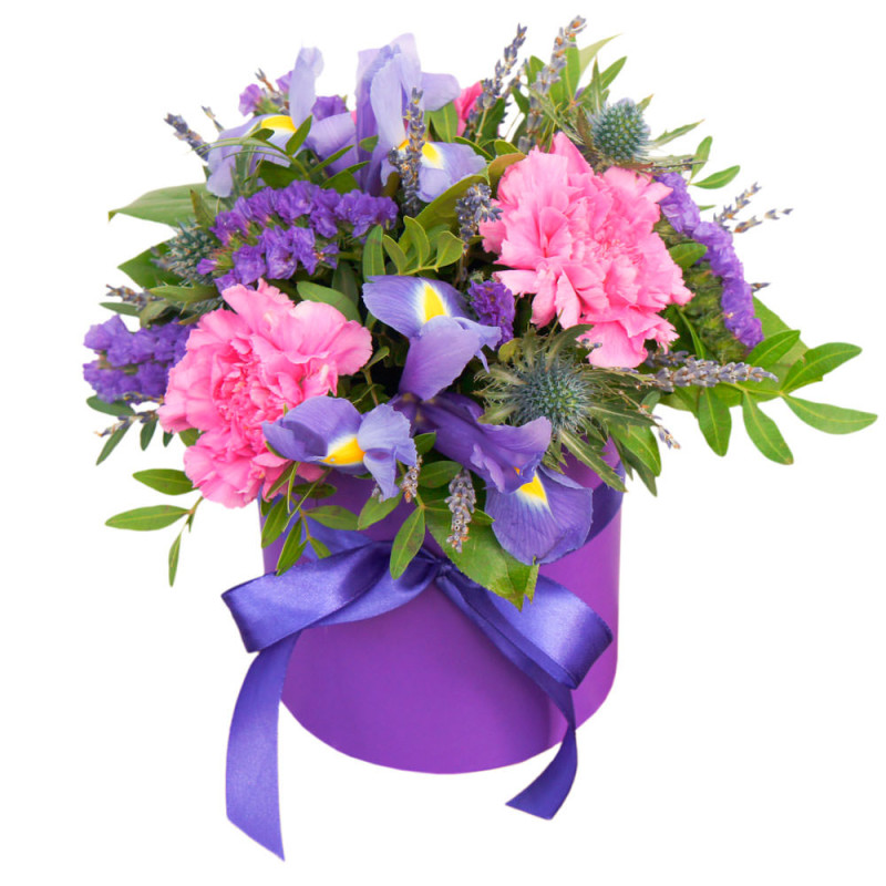 Яркие розовые гвоздики и нежные ирисы создают атмосферу романтики и нежности. В букете также присутствуют лимониум, эрингиум, фисташка и статица. Композиция оформлена в стильной фиолетовой шляпной коробке с атласной лентой. Идеально подойдет для юбилея и порадует любимую женщину.