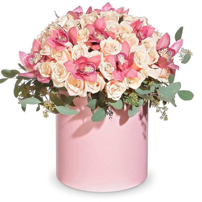 Эта нежная композиция очаровывает сочетанием кремовых кустовых роз и розовых орхидей с эвкалиптом. Цветы аккуратно расположены в розовой цилиндрической шляпной коробке, придающей букету изысканность и стиль. Такое оформление создаёт атмосферу утончённости и романтики. Идеально подойдёт для поздравления начальницы на повышение.