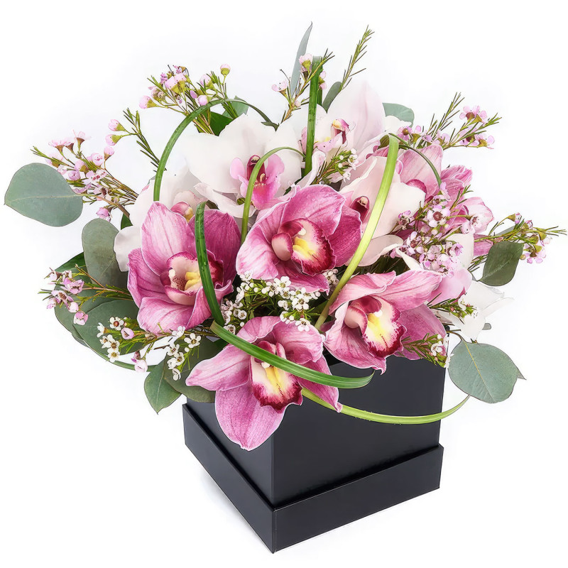Эта композиция поражает своим сочетанием нежных розовых и белых орхидей, дополненных свежим эвкалиптом. Цветы аккуратно расположены в стильной квадратной коробке черного цвета, что придает им особую элегантность. Такой букет создаст атмосферу романтики и утонченности. Идеально подойдет для поздравления любимой женщины на годовщину.