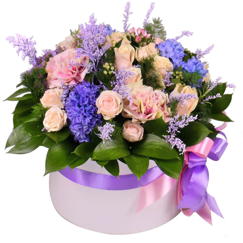 Эта композиция дарит ощущение лёгкости и романтики с нежными розовыми и кремовыми оттенками. В букете собраны синие гиацинты, кремовые кустовые розы, розовые диантусы и кремовые одноголовые розы, дополненные свежей зеленью. Упакован в стильную шляпную коробку, украшенную яркой фиолетовой и розовой лентами. Создаёт атмосферу волшебства, идеально подойдёт для благодарности врачу. Порадует любого получателя.