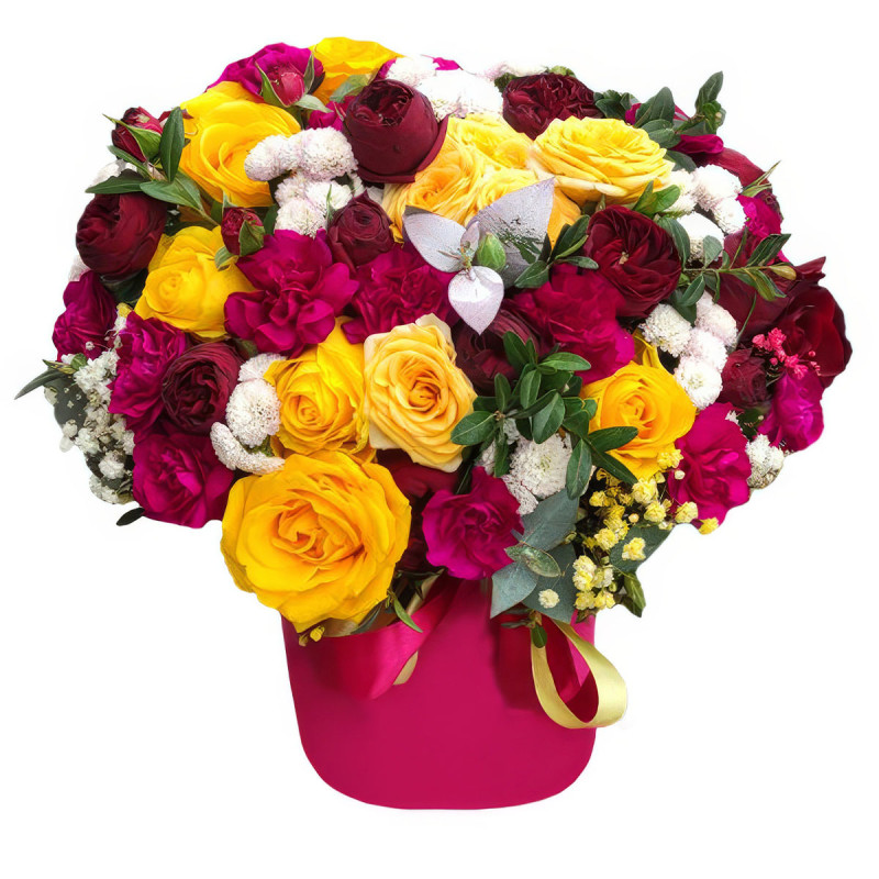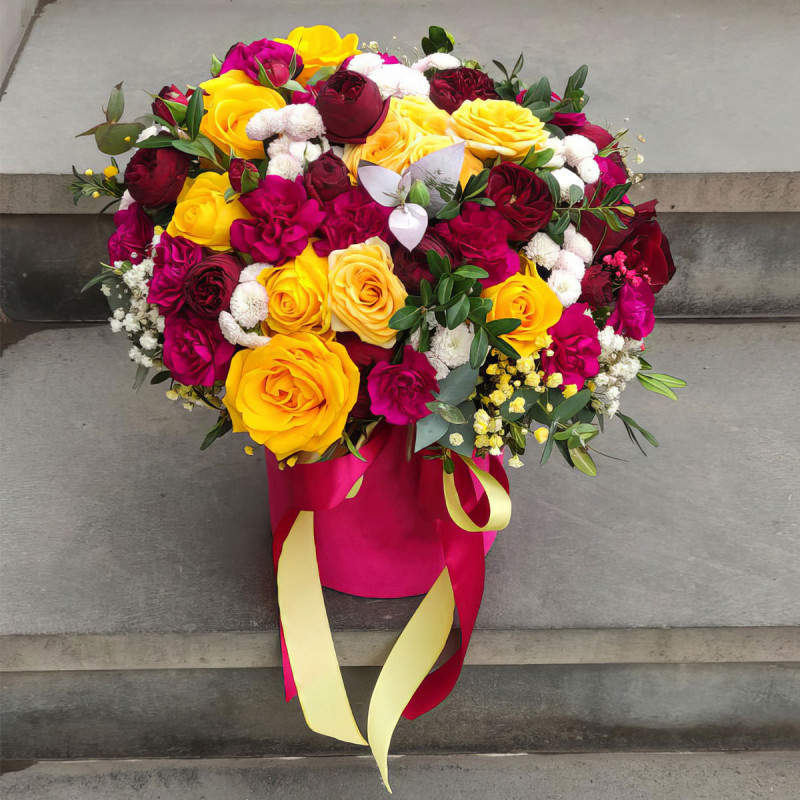 Эмоциональная гамма букета пронизана яркими жёлтыми, бордовыми и розовыми оттенками. В составе: роза кустовая жёлтая, роза пионовидная кустовая бордовая, гвоздика кустовая мини розовая, маргаритка мини белая, гипсофила и эвкалипт. Букет оформлен в яркую шляпную коробку с лентой насыщенного цвета, что подчёркивает его роскошь. Эта композиция создаёт атмосферу праздника и станет отличным подарком для любимой женщины на романтический вечер.