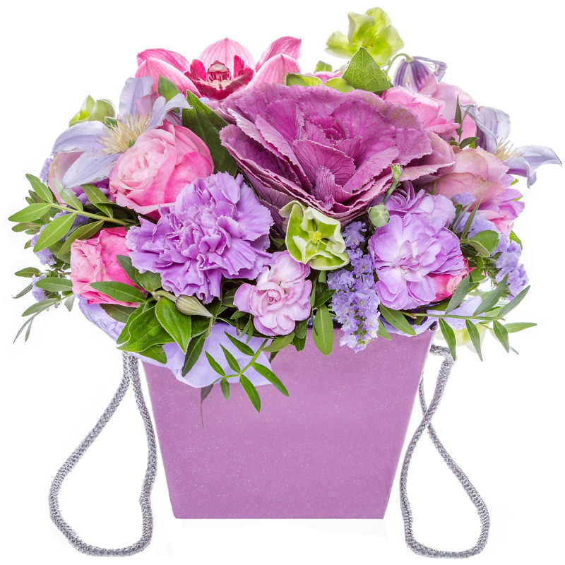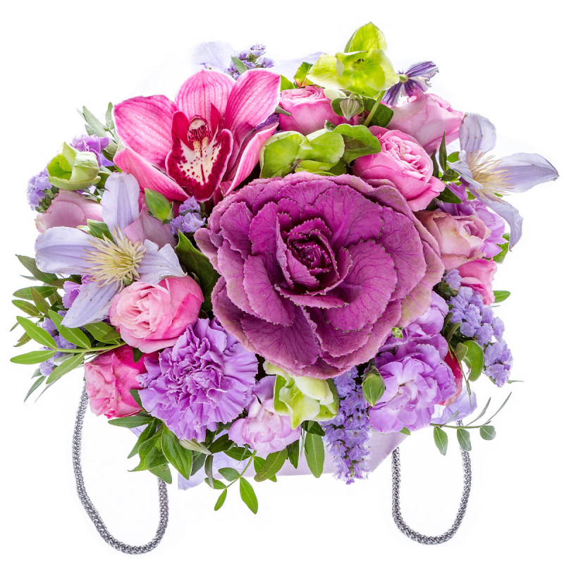 Восхитительное сочетание сиреневого и розового оттенков создаёт атмосферу нежности и романтики. В составе: декоративная капуста, розовая орхидея, розовая одноголовая роза, клематис, сиреневая статица, сиреневая петуния и фисташка. Композиция оформлена в элегантную квадратную шляпную коробку лавандового цвета с удобной ручкой. Прекрасный подарок для сестры на юбилей, создающий атмосферу волшебства и изысканности.