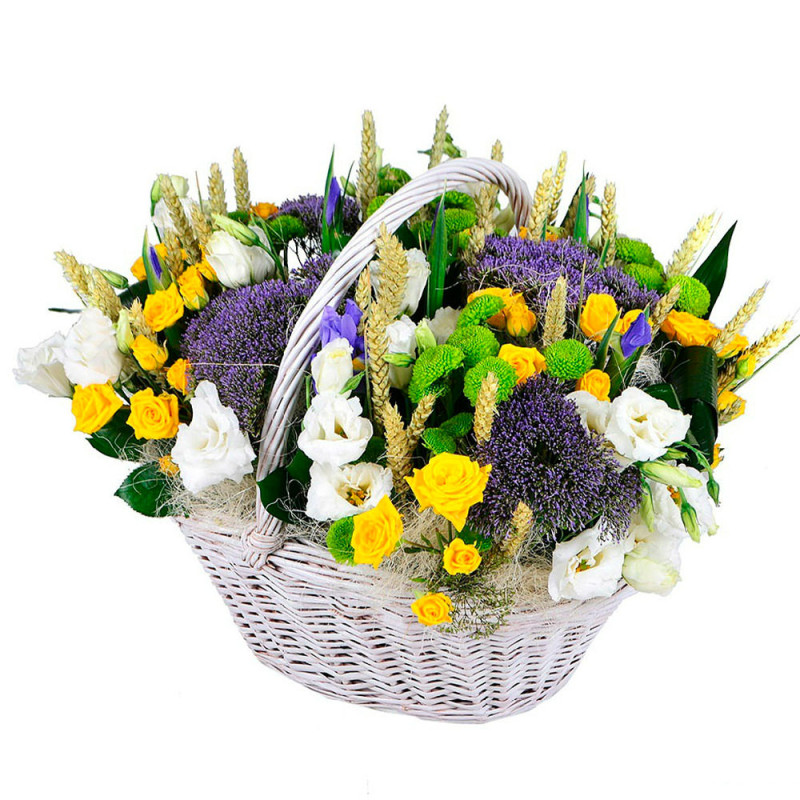 Яркие желтые кустовые розы и белоснежные эустомы создают атмосферу легкости и радости. Композицию дополняют зеленые кустовые хризантемы, фиолетовый трахелиум и золотистые колосья. Все цветы аккуратно размещены в белой плетеной корзине с оазисом. Этот букет создаст праздничное настроение на выпускной вечер и станет великолепным подарком для преподавателя.
