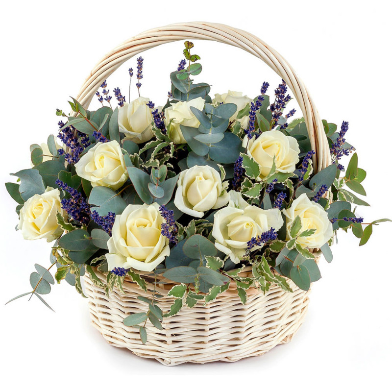 Эта композиция создает атмосферу легкости и гармонии благодаря нежным белым розам, ароматному эвкалипту и изысканной лаванде. Все цветы аккуратно уложены в плетёную корзину с оазисом, что придает букету особую устойчивость и свежесть. Композиция станет отличным подарком для любимой женщины на романтический вечер.
