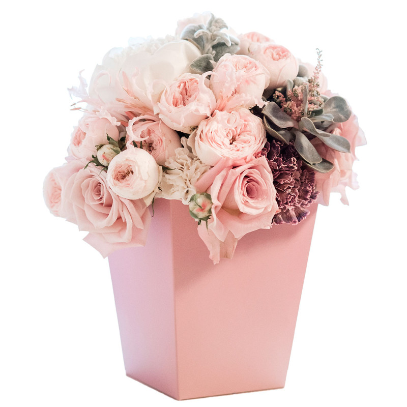 Эта композиция в розовых тонах подарит ощущение нежности и романтики. В состав входят пионовидные розы, одноголовые розы, белые пионы, бордовые гвоздики и суккуленты. Цветы аккуратно расположены в квадратной коробке нежно-розового цвета. Такой букет создаёт атмосферу изысканности и будет прекрасным подарком для любимой женщины на День Святого Валентина.