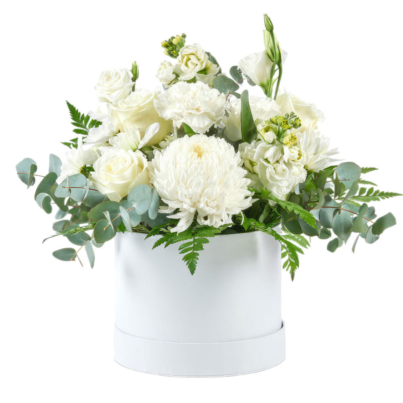 Эта композиция в белоснежных тонах вызывает ощущение чистоты и утончённости. В составе присутствуют белые хризантемы, розы, диантусы, маттиолы и альстромерии, дополненные эвкалиптом и папоротником. Упакованы цветы в элегантную белую шляпную коробку, что придаёт им особый шарм. Этот букет создаёт атмосферу лёгкости и свежести. Идеально подойдёт для поздравления учительницы на День знаний.