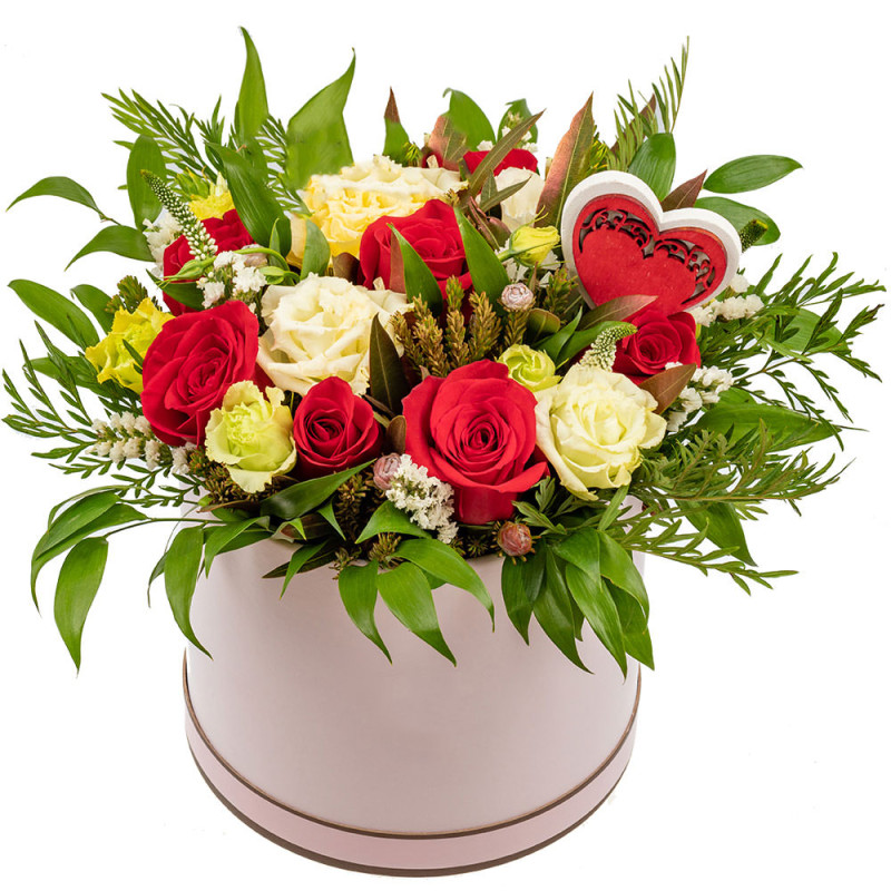 Яркое сочетание красных и белых оттенков создаёт праздничное настроение. В составе букета — красные одноголовые розы и белая эустома, дополненные рускусом итальянским и зелёным миксом. Композиция представлена в стильной шляпной коробке светлого тона. Этот букет отлично подойдёт для поздравления друга на День города.