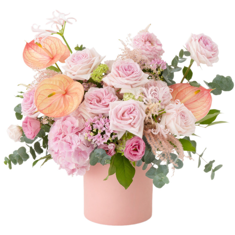 Очарование розовых оттенков захватывает дух. В составе букета роза одноголовая кенийская розовая, розовый голландский крестоцвет, фламинго-лилия голландская персиковая, роза розовая сорта ‘Аваланж’, нерина розовая, гортензия розовая, эвкалипт. Цветы оформлены в стильную шляпную коробку, которая добавляет изысканности. Эта композиция создаёт атмосферу утончённой элегантности и станет прекрасным подарком для подруги на День знаний.