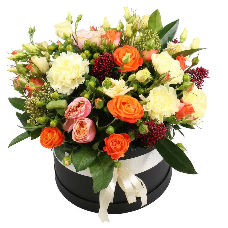 Потрясающая композиция в оранжево-кремовых тонах поднимет настроение на весь день. В составе: оранжевая кустовая роза, розовая пионовидная роза, кремовая эустома и диантус, гиперикум и зелень. Композиция украшена в элегантной черной шляпной коробке с белой лентой. Создаст атмосферу радости и уюта. Подойдет для поздравления коллеги на профессиональный праздник.