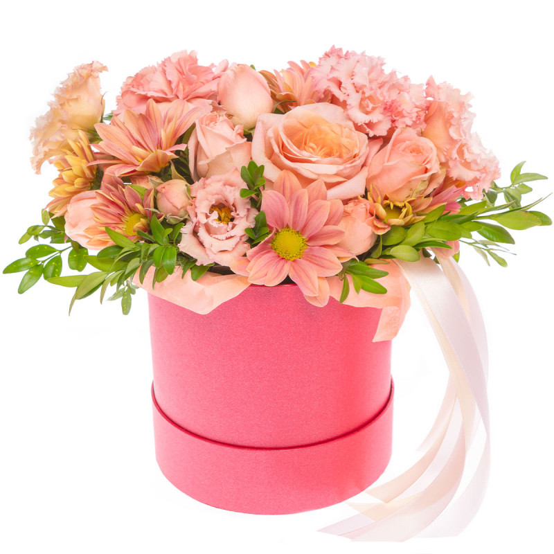 Эта композиция из розовых и персиковых оттенков дарит ощущение нежности и романтики. В состав входят одноголовые персиковые розы, розовые кустовые хризантемы и розовая эустома, дополненные свежей зеленью. Упакованы цветы в стильную шляпную коробку ярко-розового цвета, украшенную белой лентой. Этот букет создаёт атмосферу утончённой элегантности и идеально подойдёт для подарка на годовщину любимой женщине.