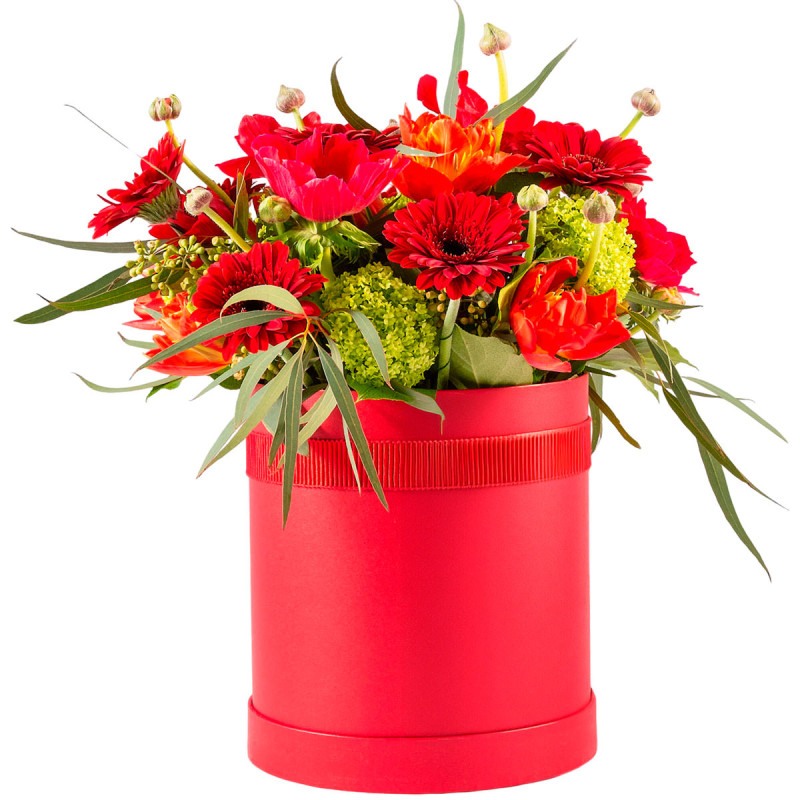 Энергия красного и зелёного оттенков создаёт динамичное настроение. В составе композиции: красная гербера, мак, эриогонум и эвкалипт. Цветы оформлены в ярко-красную цилиндрическую коробку с лентой. Эта композиция добавит яркости на новоселье и порадует молодую маму.