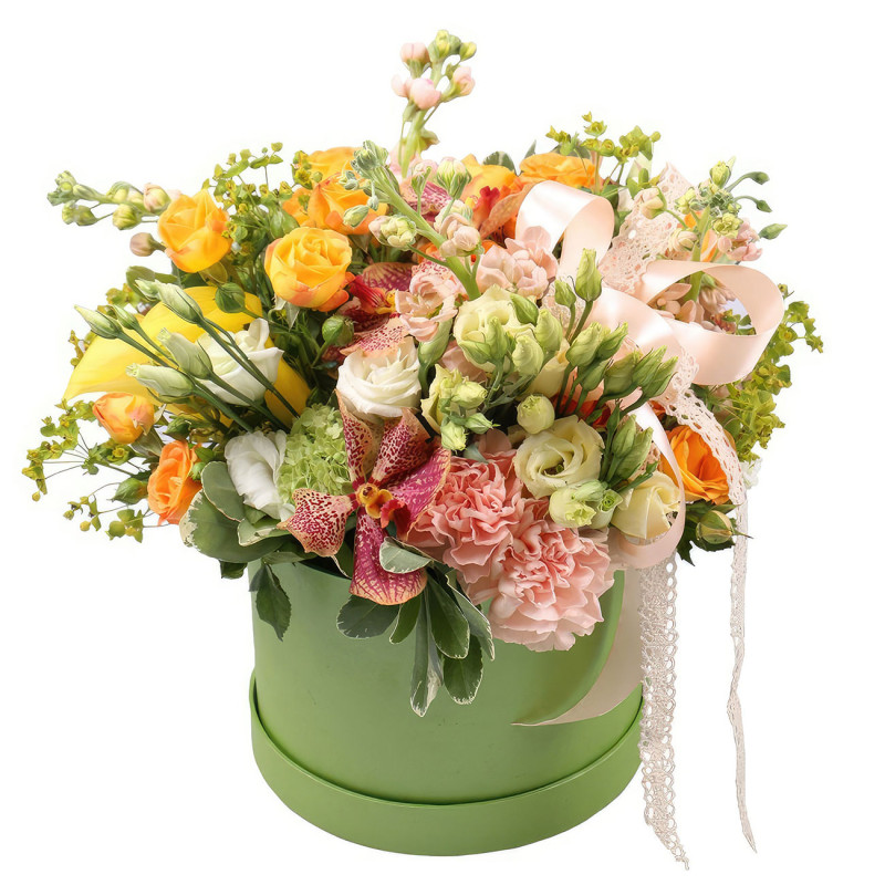 Яркая, солнечная композиция, состоящая из жёлтых калл, кустовых роз, розовой маттиолы, кремовой эустомы и розовых диантусов, гармонично сочетается с зеленью. Все цветы аккуратно уложены в стильную зелёную цилиндрическую коробку, украшенную нежной лентой. Такой букет создаёт атмосферу радости и тепла. Идеально подойдёт на платиновую свадьбу для молодожёнов.