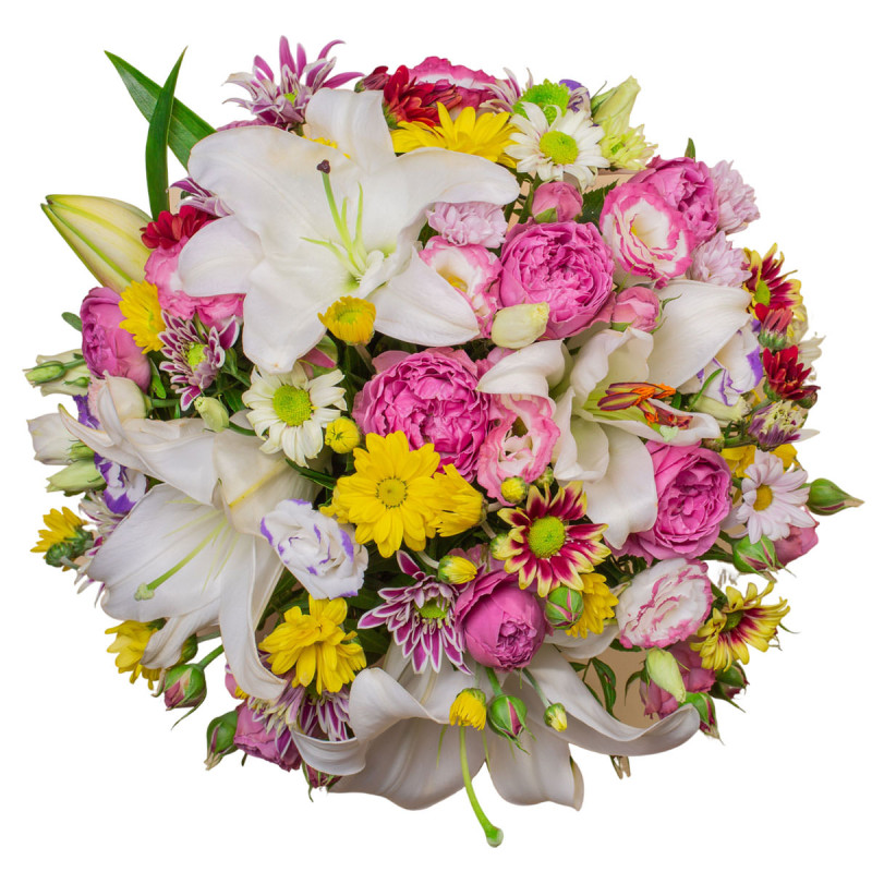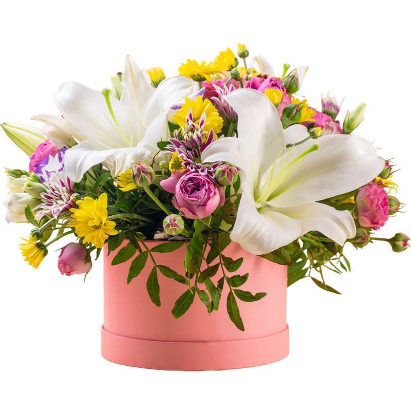 Яркая палитра розового, белого и жёлтого цветов создаёт атмосферу весеннего тепла. Композиция состоит из белых лилий, жёлтых и сиреневых кустовых хризантем, розовых пионовидных роз и бело-фиолетовых эустом, дополненных зеленью фисташки. Цветы аккуратно расположены в круглой розовой коробке, подчёркивающей их изысканность. Такой подарок создаст атмосферу радости и станет отличным решением на День влюблённых для любимой женщины.
