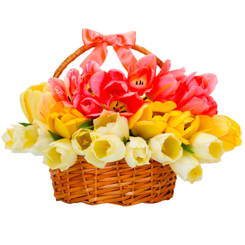 Яркая и жизнерадостная композиция в корзине, сочетающая розовые, белые и желтые тюльпаны. Каждое настроение весны собрано в этой корзине с плетёной ручкой и украшено атласной лентой. Создаёт атмосферу радости и свежести, идеально подходящая на 8 Марта для мамы.