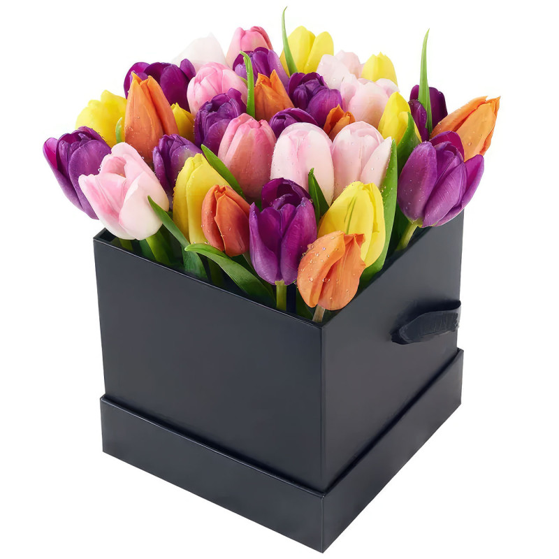 Тюльпаны в квадратной коробке «Весенний микс» можно купить в интернет-магазине - kupit-buketu.ru. Только молодые цветы. Свыше 50 дизайнов упаковок. Букеты упаковывают более 100 флористов.
