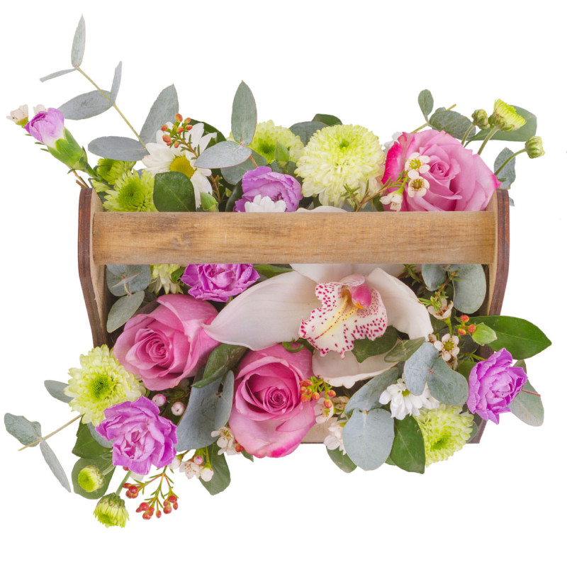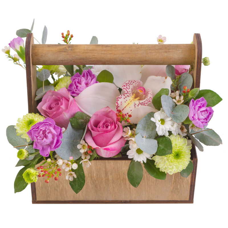 Нежная палитра розовых, белых и сиреневых оттенков создаёт атмосферу утончённости. В состав входят белая орхидея, розовая роза, сиреневая гвоздика, белая и зелёная кустовая хризантема, ваксфлауэр, гиперикум и эвкалипт. Композиция оформлена в стильном дешевянном ящике с ручкой. Идеально подойдёт для поздравления коллеги на повышение, радость для любимой женщины.